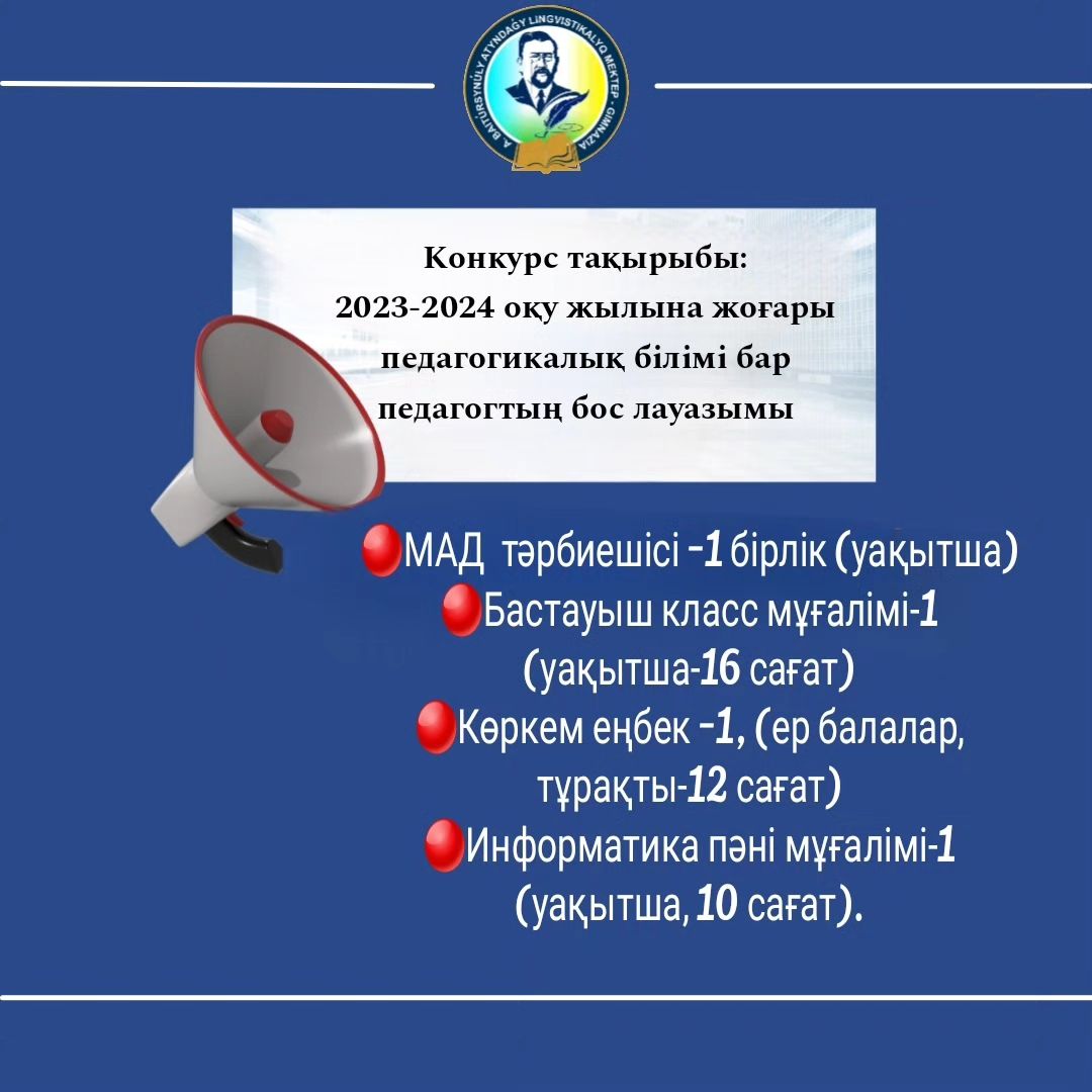 Ахмет Байтұрсынұлы атындағы лингвистикалық мектеп-гимназия жоғарыдағы бос лауазымдарға конкурс жариялайды.
