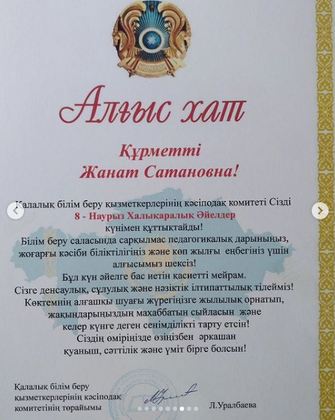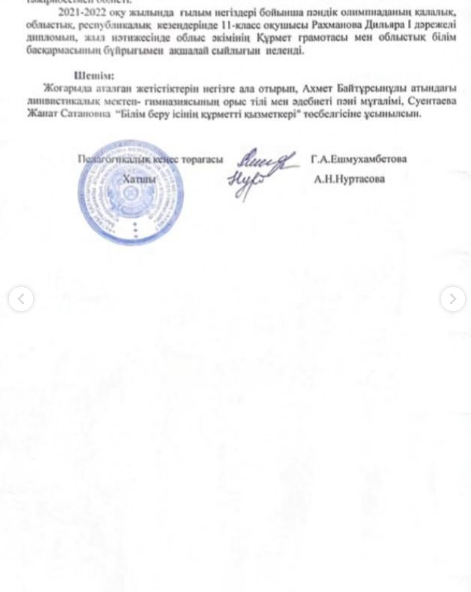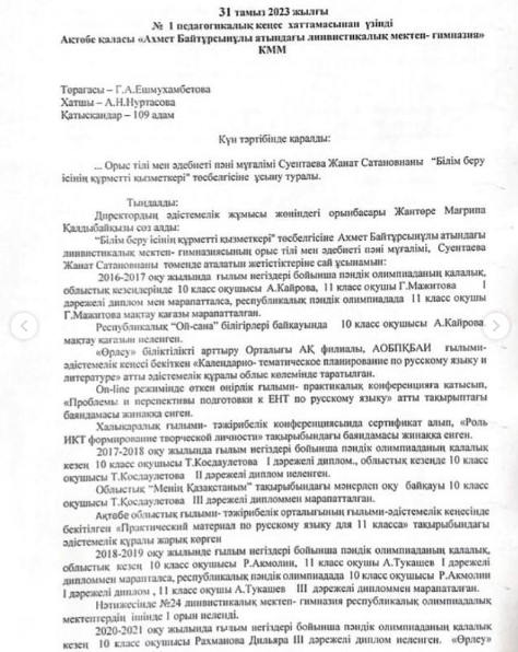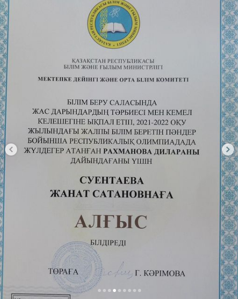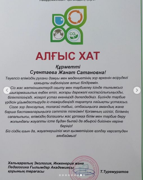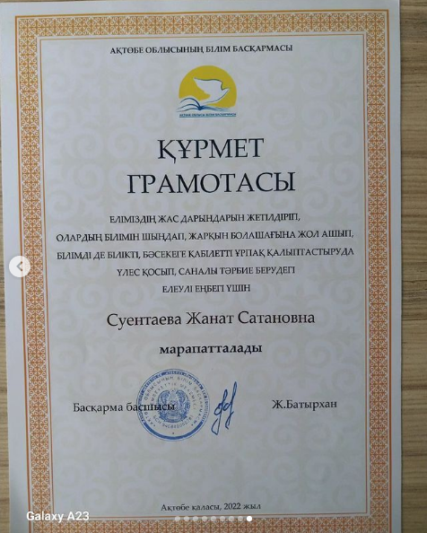 "БІЛІМ БЕРУ ІСІНІҢ ҚҰРМЕТТІ ҚЫЗМЕТКЕРІ" төсбелгісіне ұсынылған кандидат ✔️Суентаева Жанат Сатановна