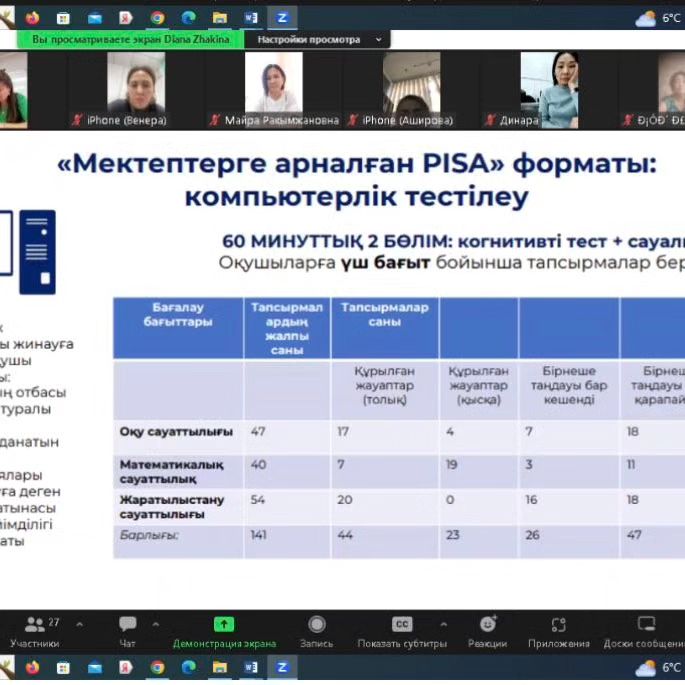 РISA тестілеуінің мақсат-міндеттері мен зерттеу барысы туралы ата - аналарға, оқушыларға жиналыс өткізіліп,түсіндіру жұмыстары жүргізілді.Жалпы дайындық барысы мектеп әкімшілігі мен пән мұғалімдерінің бақылауында. Дайындық негізгі үш бағыт “математикалық сауаттылық”, “жаратылыстану сауаттылығы” және “оқу сауаттылығы” бойынша жүргізіліп жатыр.