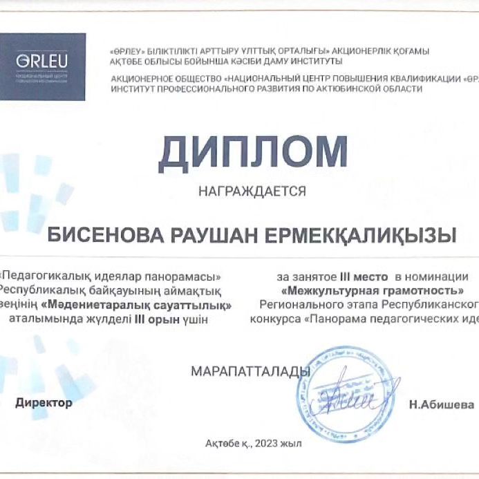 Республикалық "Педагогикалық идеялар панорамасы" байқауының аймақтық кезеңінде “Мәдениетаралық сауаттылық” бағыты бойынша ІІІ орын иеленген көркем еңбек пәні мұғалімі Бисенова Раушан Ермекқалиқызын құттықтаймыз.
