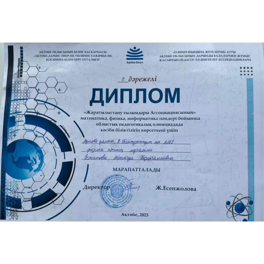 “Жаратылыстану ғылымдарының Ассоциациясының” математика, физика, информатика пәндері бойынша облыстық педагогикалық олимпиадада ІІ дәрежелі дипломмен марапатталған физика пәні мұғалімі Есжанова Айымгул Базаргалиевнаны құттықтаймыз.