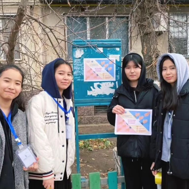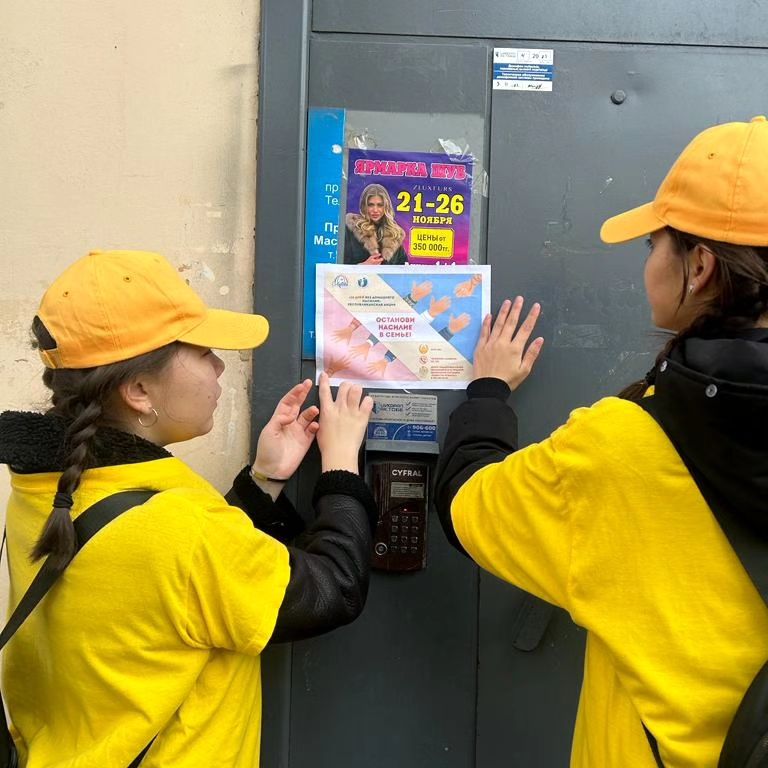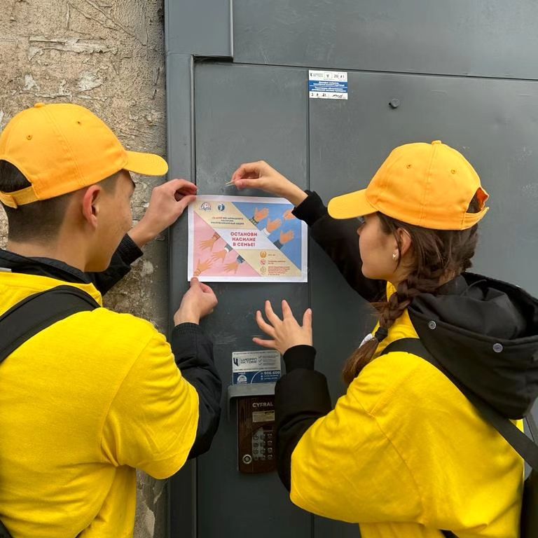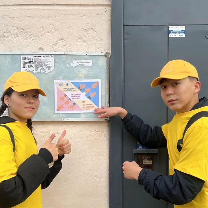 "Жеткіншектің жеті жарғысы" жобасы аясында мектеп-гимназияның Еріктілер тобы мүшелері көп қабатты мектеп-гимназия ауданына қарасты тұрғын үйлердің хабарландыру тақталарына "Тұрмыстық зорлық-зомбылыққа қарсы" акпараттық