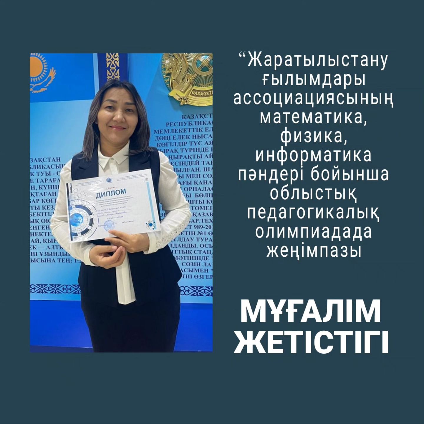 “Жаратылыстану ғылымдарының Ассоциациясының” математика, физика, информатика пәндері бойынша облыстық педагогикалық олимпиадада ІІ дәрежелі дипломмен марапатталған физика пәні мұғалімі Есжанова Айымгул Базаргалиевнаны құттықтаймыз.