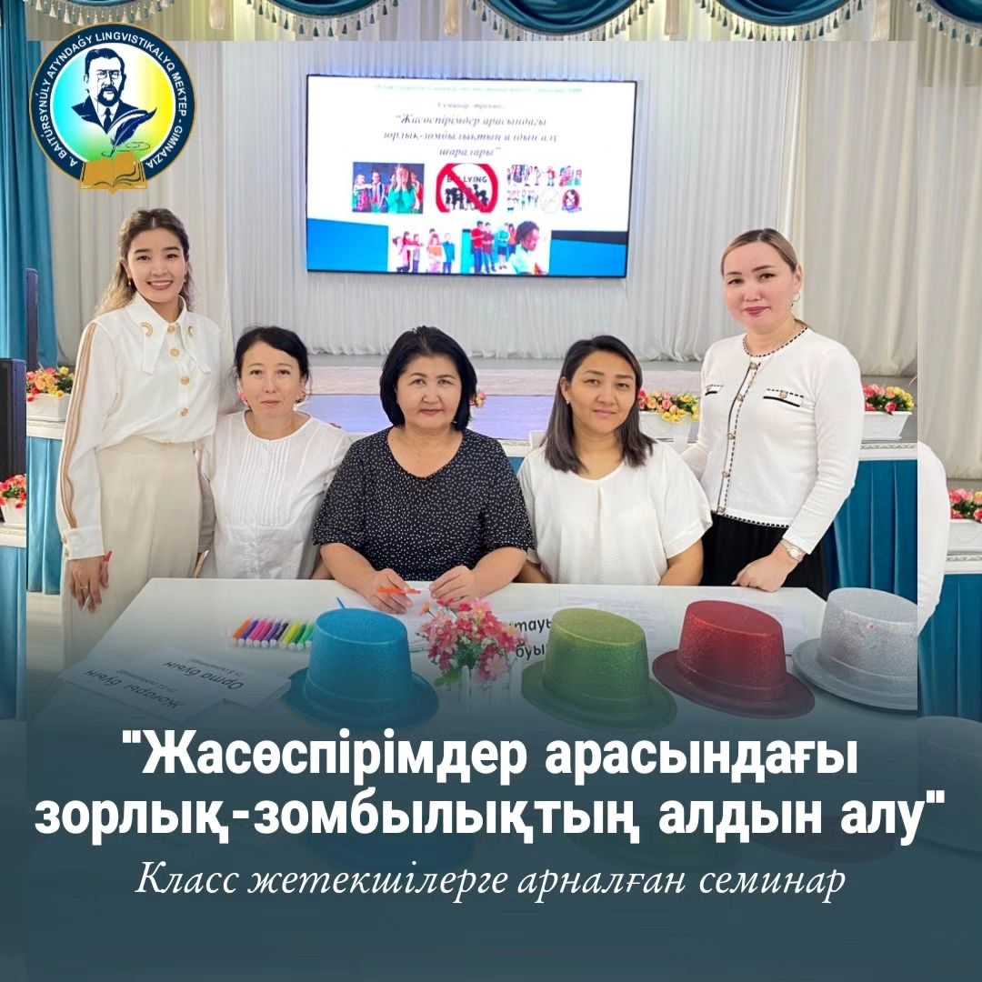 Сынып жетекшілеріне арналған "Жасөспірімдер арасындағы зорлық-зомбылықтың алдын алу" тақырынбында семинар-тренинг өтті. Мақсаты: Сынып жетекшілерге зорлық-зомбылықтың кері әсерлерін түсіндіру, ата-аналармен жағымды қарым-қатынас орната білуге үйрету, жасөспірімдер арасындағы зорлық-зомбылықтың алдын алу шаралары.