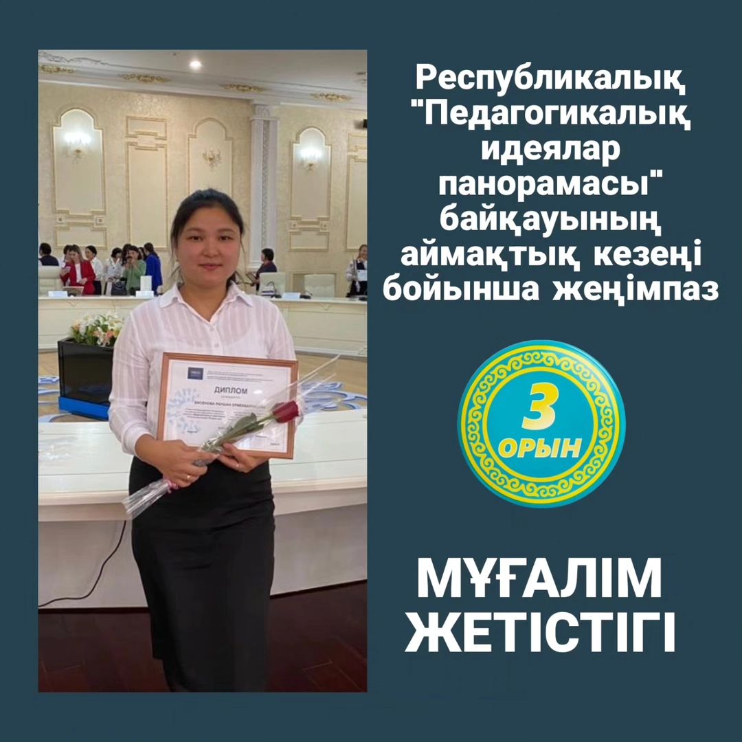 Республикалық "Педагогикалық идеялар панорамасы" байқауының аймақтық кезеңінде “Мәдениетаралық сауаттылық” бағыты бойынша ІІІ орын иеленген көркем еңбек пәні мұғалімі Бисенова Раушан Ермекқалиқызын құттықтаймыз.