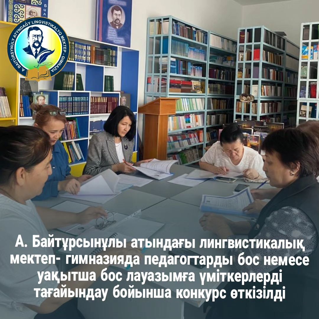 А. Байтұрсынұлы атындағы лингвистикалық мектеп- гимназия педагогтарды бос немесе уақытша бос лауазымға үміткерлерді тағайындау бойынша ҚР Білім және ғылым министрінің 2012 жылғы 21 ақпандағы №57 бұйрығының 3 тарауы, 162 тармақшасына сәйкес конкурс өткізілді. Конкурс шешімі бойынша педагогтардың бос немесе уақытша бос лауазымына төмендегідей маман қабылданды: