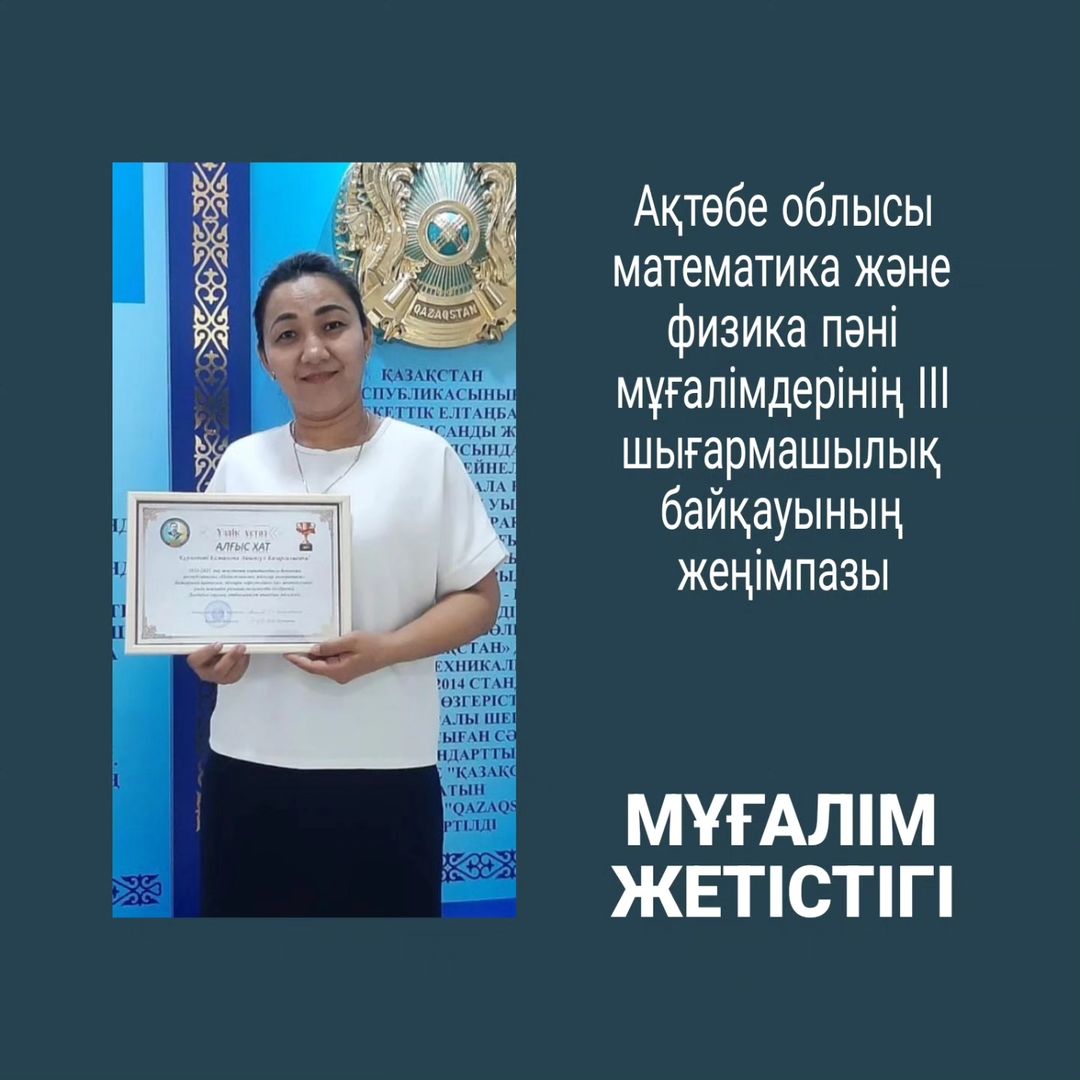 Ақтөбе облысы математика және физика пәні мұғалімдерінің ІІІ шығармашылық байқауында ІІІ дәрежелі дипломмен марапатталған Есжанова Айымгул Базаргалиевнаны құттықтаймыз.