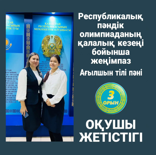 🥉Республикалық пәндік олимпиаданың қалалық кезеңінен ағылшын тілі пәні бойынша 3 - орын иеленген Латыпова Айгүл 10 ”А” сынып оқушысы