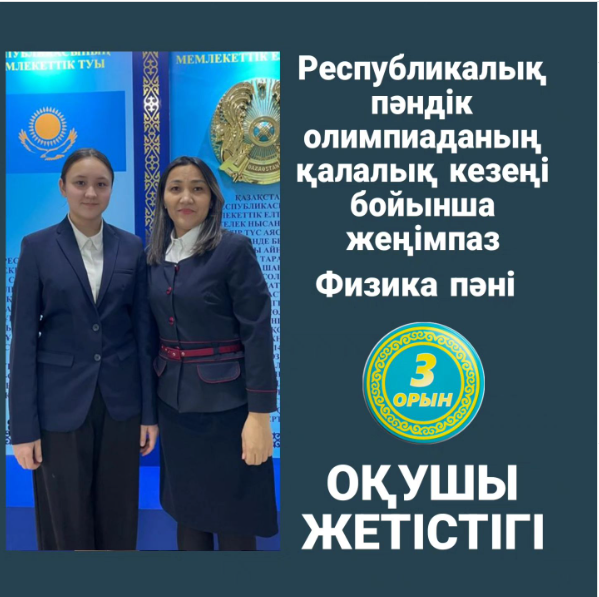🥉Республикалық пәндік олимпиаданың қалалық кезеңінен физика пәні бойынша 3 - орын иеленген Кульшарова Адэль 11” В” сынып оқушысы