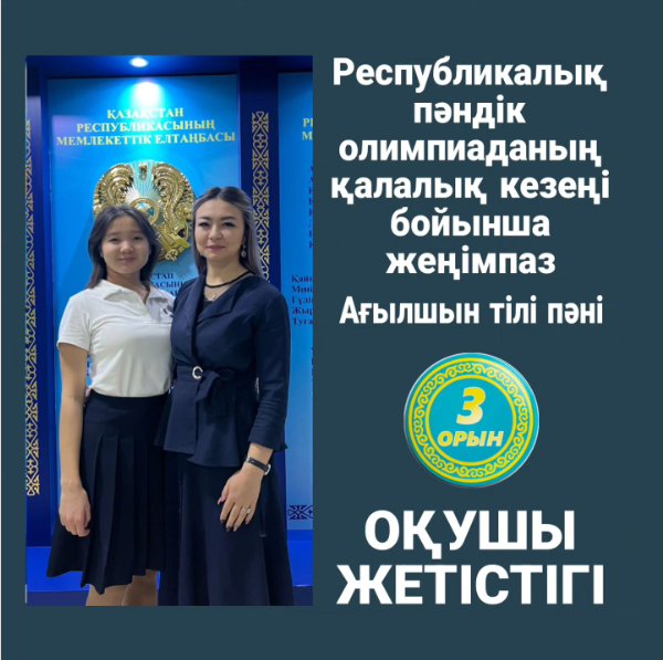 Республикалық пәндік олимпиаданың қалалық кезеңінен ағылшын тілі пәні бойынша 3 - орын иеленген Алибекова Ботакоз 9 ”Ә” сынып оқушысы