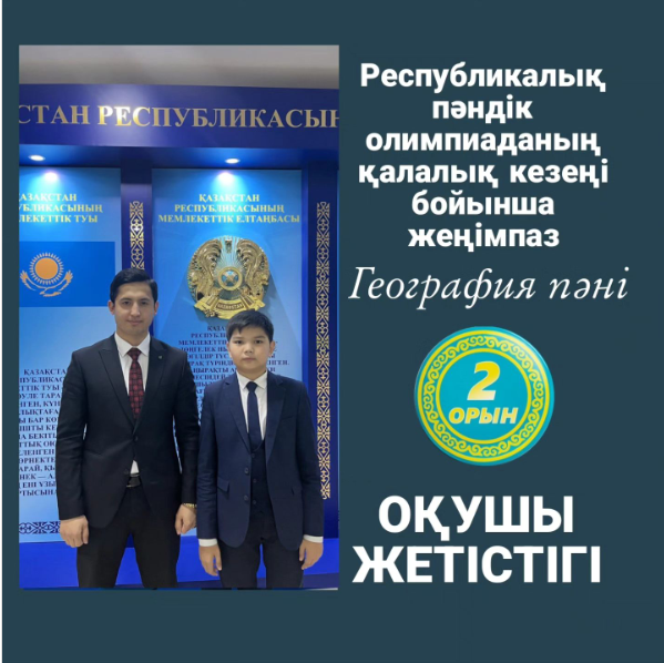 🥈Республикалық пәндік олимпиаданың қалалық кезеңінен география пәні бойынша 2-орын иеленген Ермек Нурислам 8 "Г" класс оқушысы